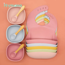 Vaisselle en silicone idéale pour les bébés de plus de 6 mois. Un grand ensemble de 10 pièces, composé d'un bol, d'une cuillère, d'une fourchette, d'un gobelet à collation, d'un gobelet à eau, d'un bavoir...