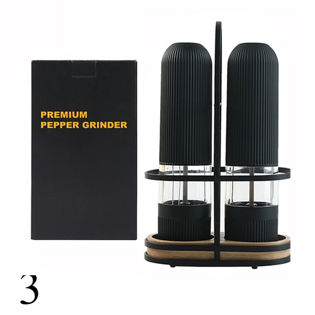 Ensemble moulin à sel et poivre électrique noir ultra chic et élégant. Ces broyeurs automatiques sont le complément parfait et sans tracas à votre table ; ajoutant un peu de luxe à votre expérience culinaire.