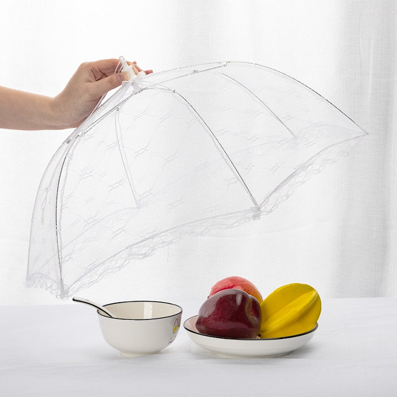 This Portable Umbrella Food Cover is the perfect solution for outdoor dining and picnics. With its compact and convenient design, you can easily carry it with you wherever you go and keep your food safe from pests and other unwanted visitors. The umbrella-shaped cover expands to [60x28cm], providing ample coverage for plates, bowls, and other dishes. The top of the cover is made from a durable, food-grade material that is safe for contact with food, and the frame is constructed from sturdy, rust-resistant metal. The cover is easy to set up and collapse, making it perfect for outdoor use. Simply pull the centre pole up to expand the cover, and press down to collapse it when you're ready to pack up. The compact size makes it easy to store in a backpack, picnic basket, or even a large purse. Whether you're enjoying a picnic in the park, camping in the great outdoors, or simply dining al fresco in your own backyard, this Portable Umbrella Food Cover is the perfect companion. So why wait? Get yours today and enjoy your meals in peace