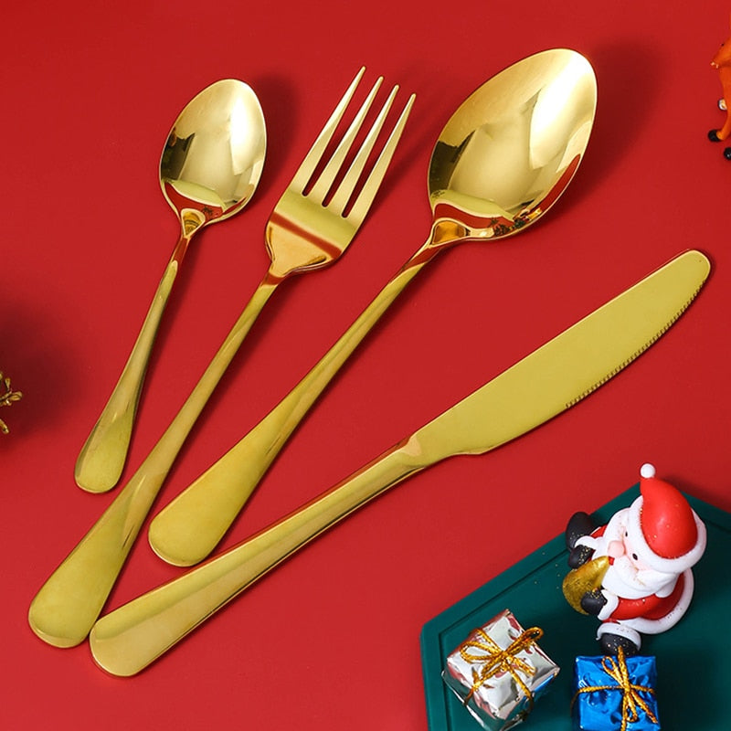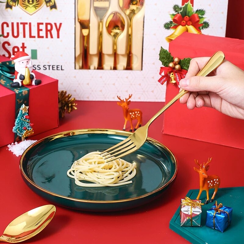 This 24-piece Christmas Gifts Cutlery Set is the perfect present for anyone who loves to cook or entertain. Made from high-quality stainless steel, this set includes [insert number of pieces, e.g. 24] pieces, including forks, knives, spoons, and teaspoons, making it ideal for both everyday use and special occasions. The sleek and modern design of the cutlery is sure to impress, and the polished finish gives each piece a beautiful shine. The ergonomic handles of the cutlery provide a comfortable grip, even during extended use, and the balanced weight of each piece ensures ease of handling. Whether you're hosting a dinner party, setting the table for a family meal, or simply enjoying a meal on your own, this cutlery set is sure to come in handy. The convenient design of the cutlery allows for easy cleaning and storage, and the durability of the stainless steel ensures that it will last for years to come.So why wait? Surprise your friends and family this holiday season with this 24-piece Christmas Gifts Cutlery Set.