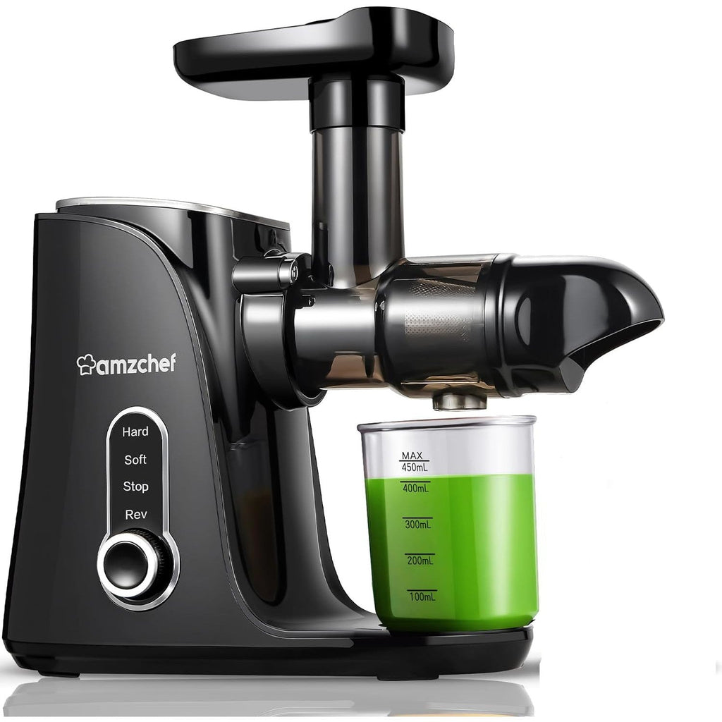 - ✔[ 2 Speeds Control & LED Display ] - The AMZCHEF slow juicer has flexible 2 speeds control design to extract various fruits and vegetables. SOFT modes runs from 50 to 60 RPM for soft and juicy fruits and vegetables like watermelon, orange, grape, celery, cucumber. HARD modes runs from 100 to 110 RPM for hard fruits like apple, pear, carrot, etc. Plus an elegant LED display panel, which makes your juicing more convenient and stylish.