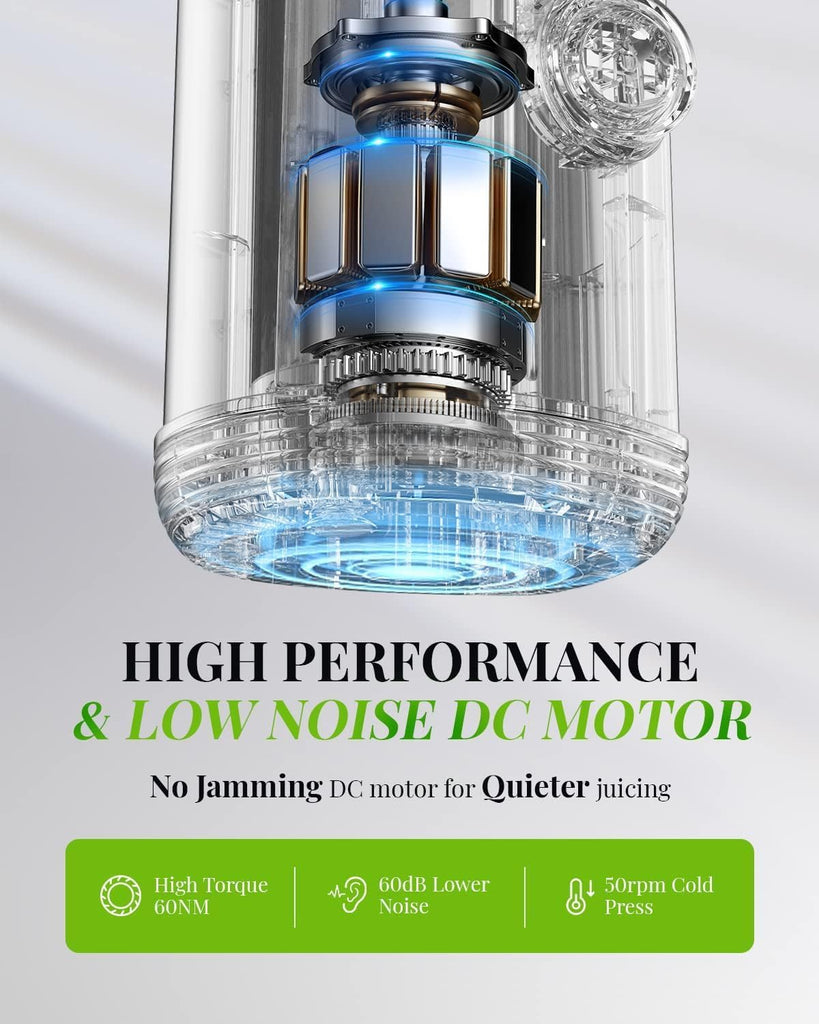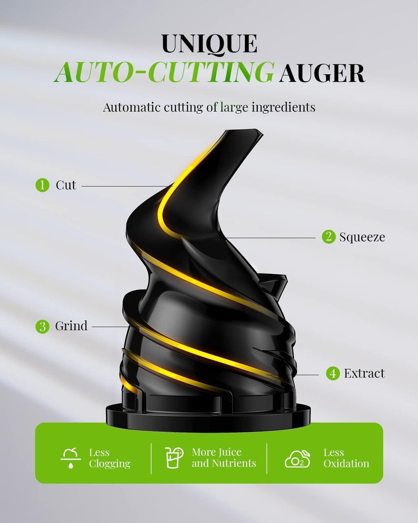 • Quiet Operation: Operates with significantly less noise than centrifugal juicers, ensuring a calm and pleasant juicing experience.